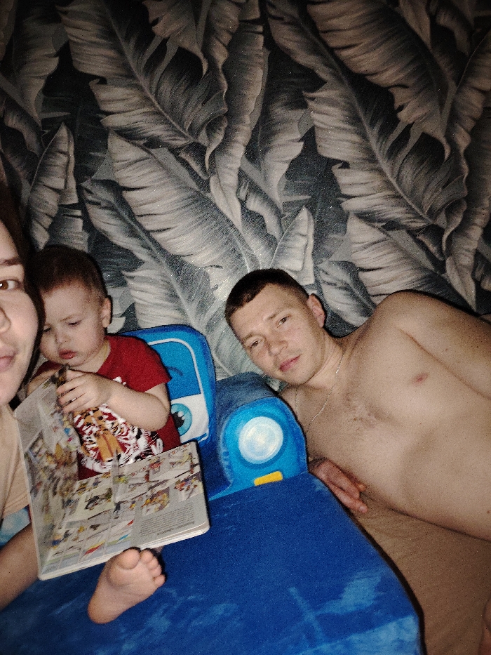 A family selfie shows a woman, a child, and a man. The child, wearing a red shirt, is reading a magazine. The man, shirtless and with short hair, lies next to the child on a blue surface. A blue toy vehicle rests between them. A woman’s face is partially visible on the left. The background features wallpaper with a repeating leaf pattern in shades of gray.
