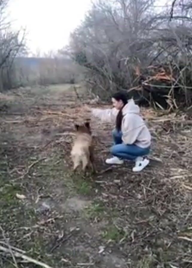 young woman with long dark hair wearing a light-colored hoodie, blue jeans, and white sneakers crouching in a sparsely wooded area with a dog. The dog, which appears to be a Belgian Shepherd, is light brown with a fluffy tail. The woman points and gives a command, and the dog runs down a narrow path lined with leafless trees and brush. The ground is covered with dead leaves, twigs, and patches of green. The sky is overcast.