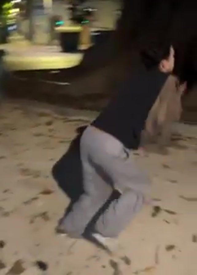 A person in a black shirt and light-colored pants jumps from a low wall and then runs across a pedestrian crosswalk in an urban park setting at night. Streetlights illuminate the scene, and there are trees and a red car visible in the background. The ground appears to be damp. The person runs towards a tree-lined path.