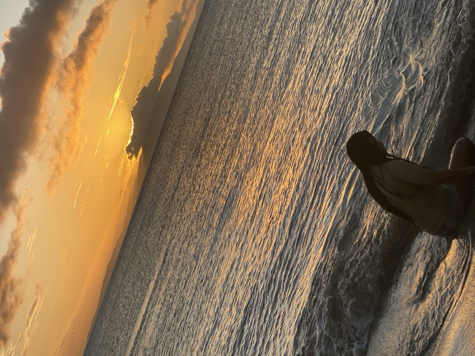 - "Golden hour paints the ocean with shimmering light, near a beach where a figure sits, partially submerged in the gentle waves" by FM-GA5i52, licensed under CC BY 4.0
