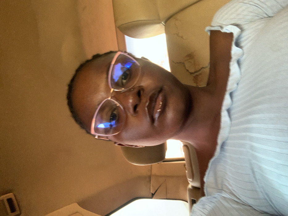 A woman is in a car. She has short, dark hair and wears pink, triangular glasses. The glasses have reflective lenses. She has dark skin and glossy lips. She wears a light blue top with a ruffled neckline. The car's interior is beige. The seat's headrest and part of the car door are visible.