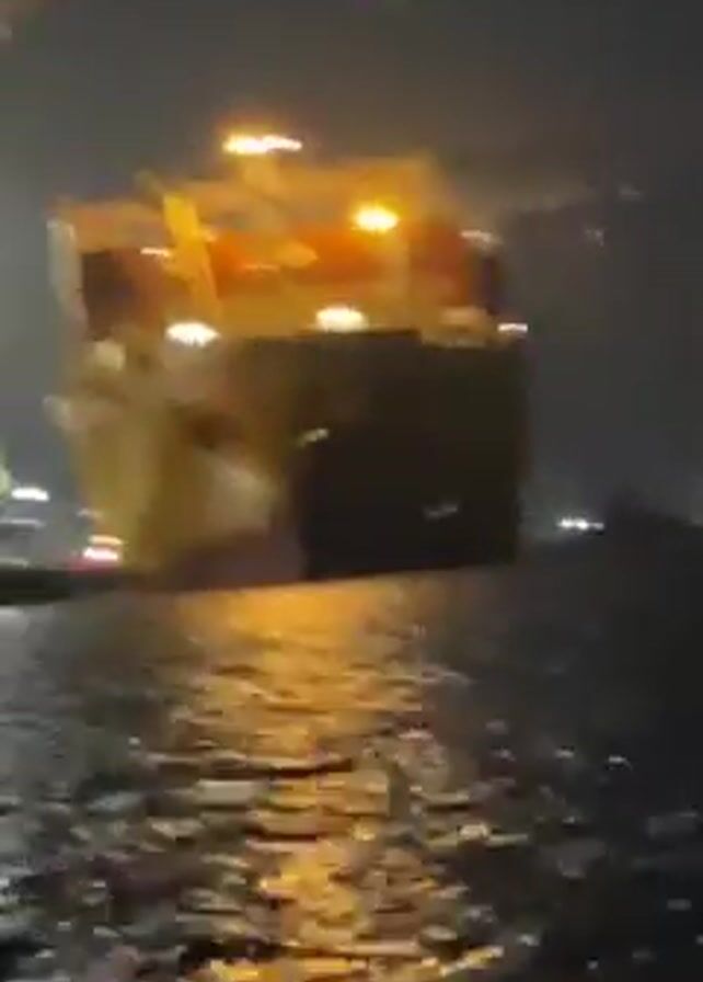 The video depicts a large cargo ship docked at a port at night