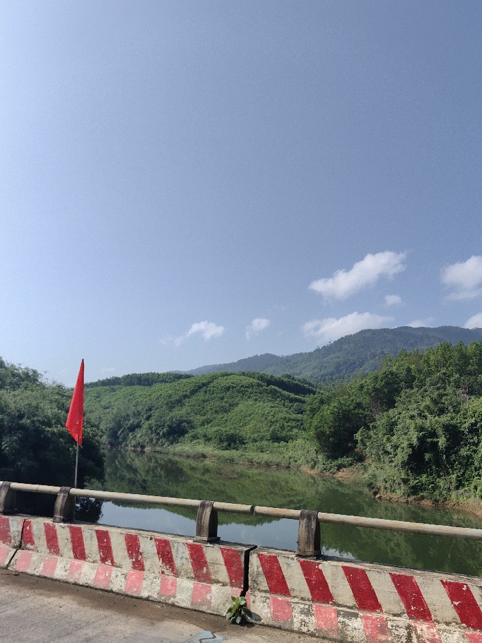 The image displays a rural landscape viewed from a bridge. In the foreground, a concrete bridge barrier with alternating diagonal red and white stripes is visible, with a small green plant sprouting from a crack near its base. Above this barrier, a metal handrail, supported by dark posts, spans the width of the bridge. Beyond the barrier, a calm body of water, likely a river or reservoir, reflects the clear blue sky and surrounding green foliage. On the left bank of this water body, a tall, tapered red flag stands prominently. The midground and background consist of undulating hills densely covered in vibrant green trees and vegetation, extending towards the horizon under a mostly clear blue sky with a few scattered white cumulus clouds. No individuals or vehicles are present. This scene is consistent with the mountainous or hilly outskirts of Huế, specifically within Thừa Thiên Huế Province, Vietnam. Such landscapes are found along routes traversing the region's natural terrain, such as portions of Quốc lộ 49 leading west from Huế city, or other areas where the Perfume River system interacts with the Truong Son mountain range.