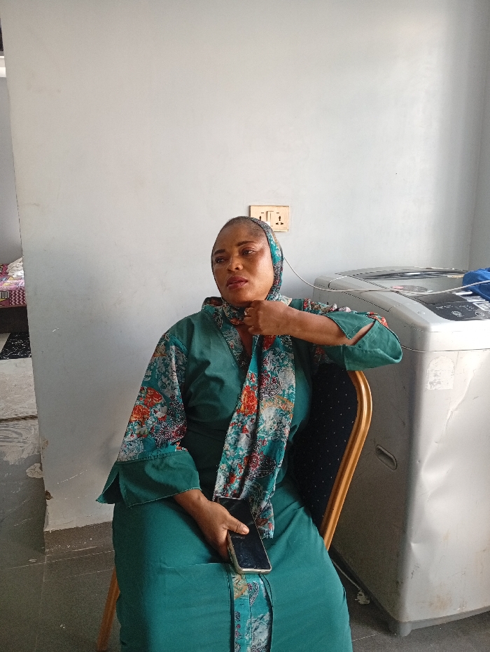 An indoor setting in Lokoja, Nigeria, depicts a middle-aged female subject seated on a brown chair with a dark blue upholstered back