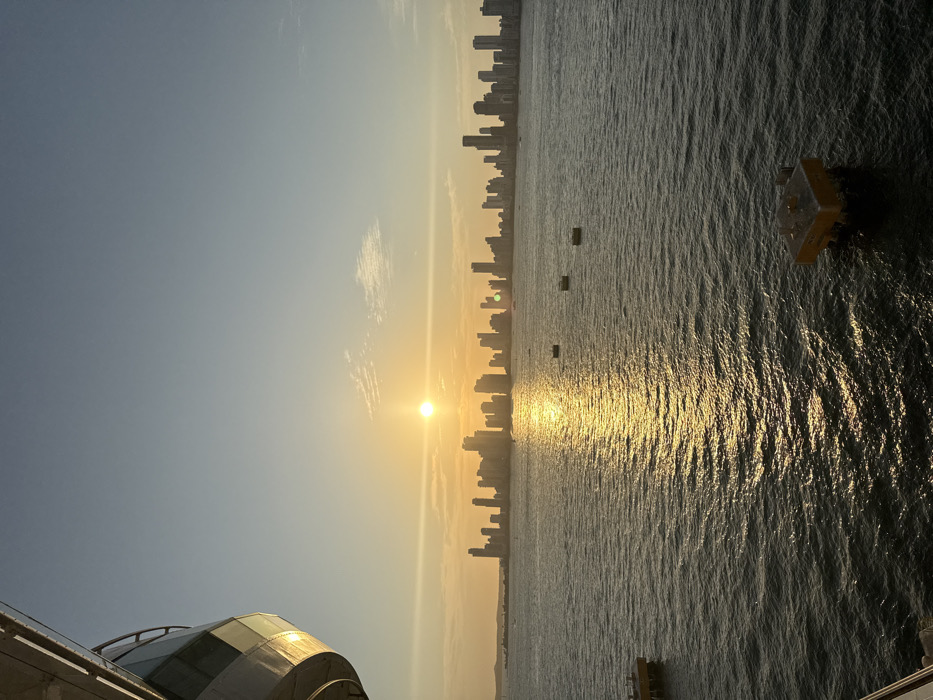 An expansive body of water stretches to a distant skyline illuminated by a bright, low sun. The sun's reflection shimmers on the water's surface, creating a golden path. A few objects float on the water's surface. The sky is a gradient of pale blue to a warm orange hue near the horizon. The lower portion of a structure, possibly a building, appears in the bottom left corner.