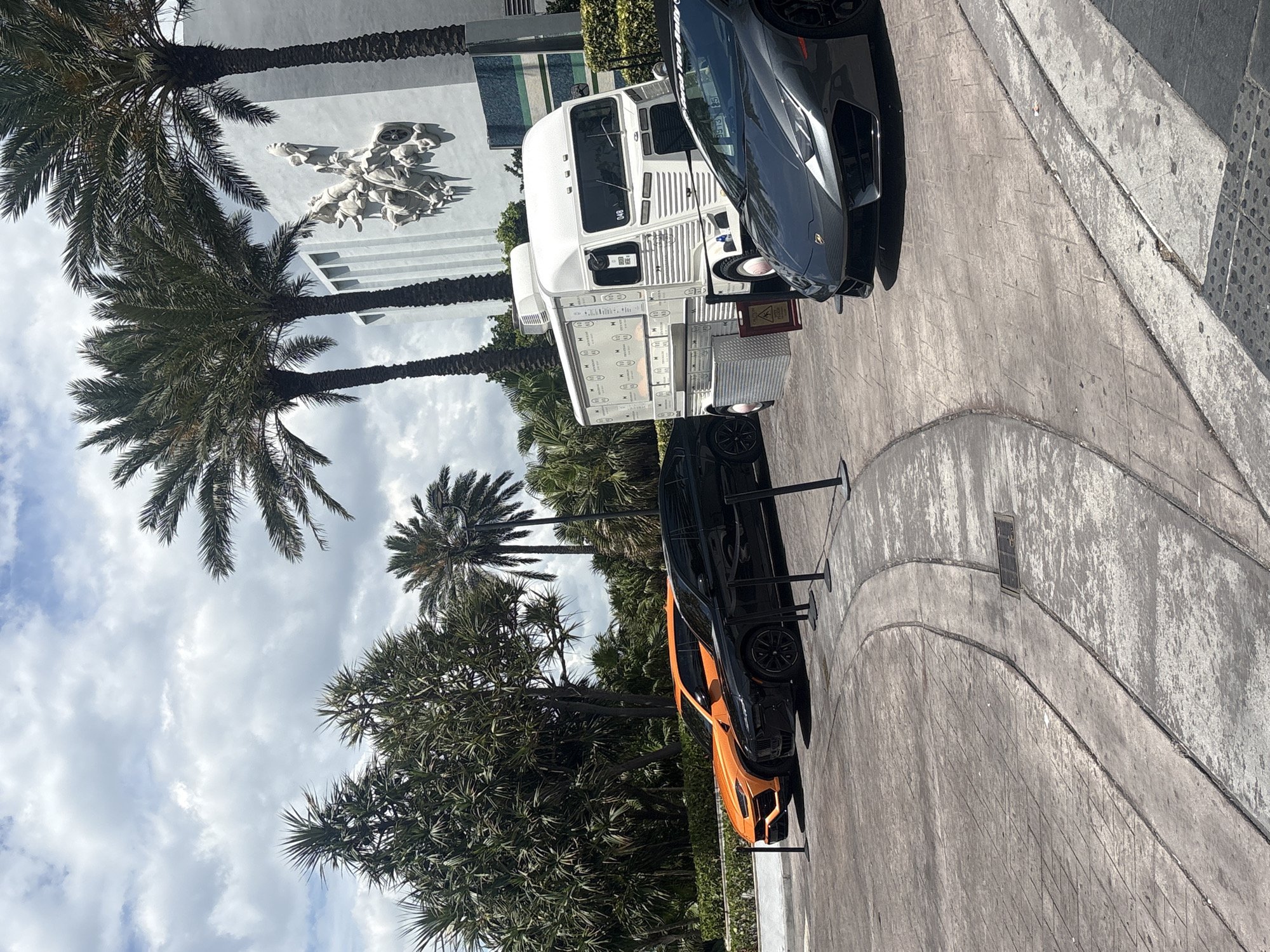 street scene in Miami Beach, United States of America. In the foreground, there is a gray concrete pavement. An orange and black sports car is parked facing the camera. A white truck with a vintage design is parked next to it. A black sports car is parked adjacent to the truck. Behind the vehicles, there are palm trees and other vegetation. A white building with an ornate sculpture on its façade is visible. The sky is cloudy.