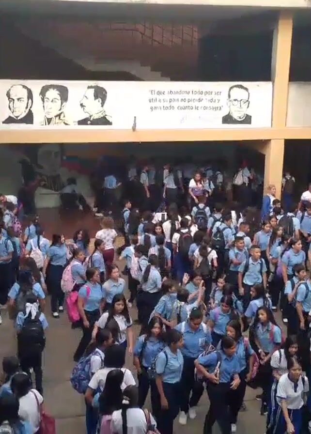 A large group of uniformed students, mostly wearing light blue shirts and dark pants or skirts, are gathered in the courtyard of a multi-story building. Many are carrying backpacks. The courtyard has a square open area in the middle, surrounded by covered walkways on multiple levels. A mural with portraits and text is visible above one of the walkways. Students are milling around, walking, and talking. The camera appears to be positioned on an upper level of the building, looking down into the courtyard. The scene gives the impression of a school during a break or transition period. The word TECNO is visible in the bottom left corner of the video frame.