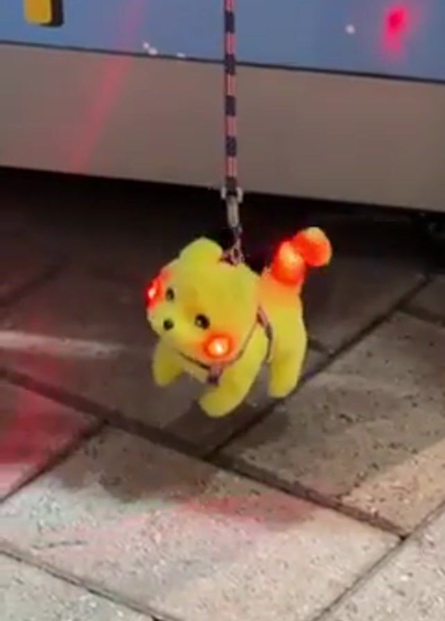 A brightly lit, yellow stuffed toy dog is being suspended over a brick surface by a colorful cord. The toy dog has a dark collar and is illuminated by red lights in its eyes and tail. The brick surface has a pattern of gray and tan rectangles. The background is partially visible, showing a side of a machine with the word "SHOP" in bright yellow, and some stars above. The scene appears to be outdoors at night.