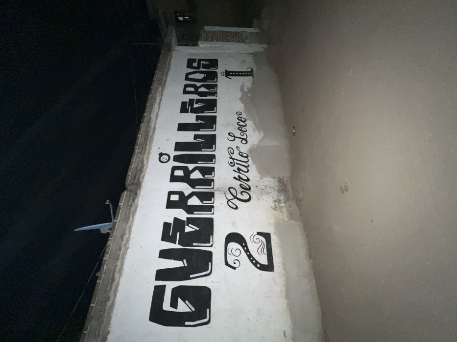 A white wall is painted with bold, black graffiti. The graffiti reads "GUERRILLEROS" vertically, followed by "Cerrito Loco". Underneath, are the numbers "21" and "1" stacked. Further down, a stylized number "2" completes the artwork. The photograph appears to have been taken outdoors at night with poor lighting.