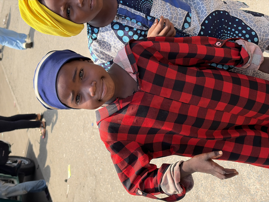 The image depicts an outdoor scene in Jakande, Nigeria, under bright daylight, focusing on two young girls. The primary subject, a young girl with dark skin and light-colored irises, occupies the foreground. She wears a navy blue headwrap with a light beige stripe and a red and black plaid long-sleeved hooded tunic. The tunic's hood opening appears worn, and its sleeves are rolled up and secured by buttoned tabs, revealing discolored inner cuff fabric. She looks directly at the camera with a slight, closed-mouth smile, her left hand resting at her side. To her right, a second young girl is partially visible, wearing a yellow headwrap and a patterned garment in shades of blue, white, and grey with abstract and circular designs. Her right hand is seen touching the first girl's left side. The ground is an uneven light grey paved surface. The background is blurred, showing the lower bodies of three additional individuals: one in light blue jeans standing near a green vehicle wheel on the left, another in black trousers and brown sandals in the mid-background, and a third in light blue attire walking towards the right. Small pieces of discarded material are visible on the paved surface.