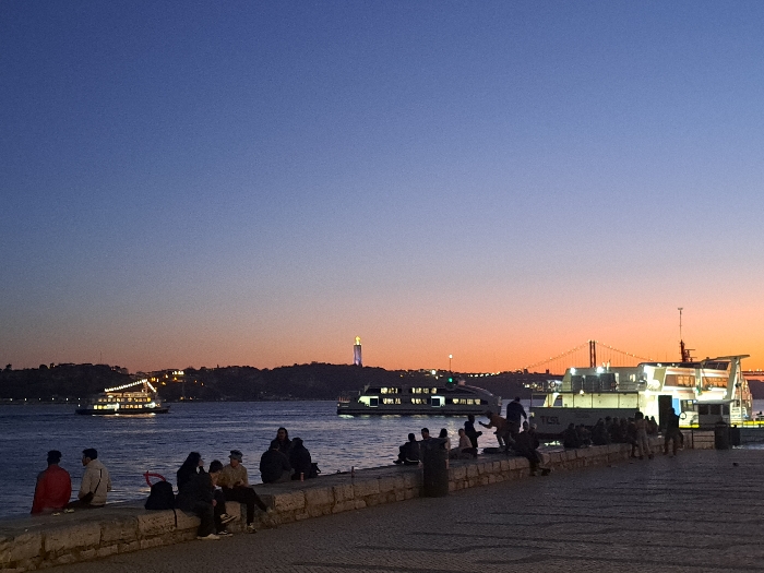 The image depicts a dusk waterfront scene in Lisbon, Portugal, viewed from the northern bank of the Tagus River. The sky presents a gradient from deep orange at the horizon to dark blue overhead. On the distant southern bank, the illuminated Sanctuary of Christ the King statue stands atop a hill to the left of the prominent 25 de Abril Bridge, which spans the river. Two significant vessels are present on the water: a brightly lit, multi-deck passenger boat travels from right to left in the mid-distance, and a larger white ferry, bearing the "TTSL" designation, is stationary or docked in the mid-ground on the right. In the immediate foreground, approximately 20-30 individuals are distributed along a stone quay and an adjacent patterned paved walkway. A majority are seated on the low stone seawall, facing the river, while others stand or walk on the pavement. Artificial lighting from the boats, distant city structures, and the Cristo Rei statue provides illumination against the ambient twilight.