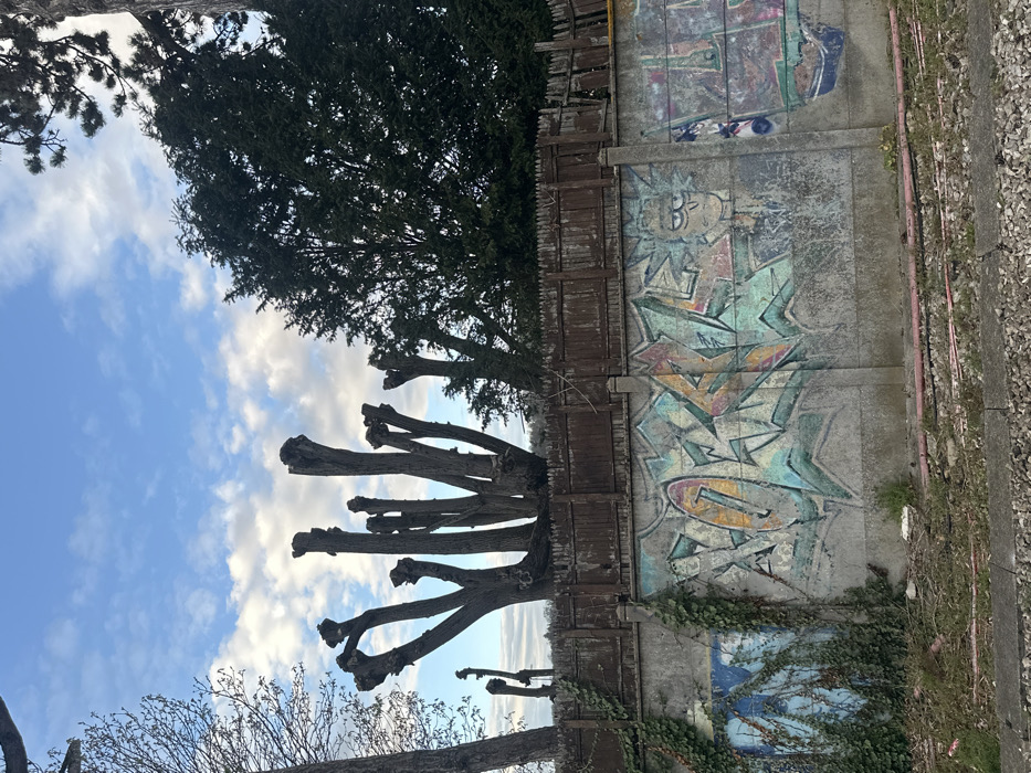 This image captures an outdoor scene in Orsay, France, under a partly cloudy blue sky with scattered white clouds. In the foreground, a narrow strip of ground composed of dirt and gravel, interspersed with sparse dry vegetation, features a horizontal reddish-pink pipe or cable. Above this, a gray concrete retaining wall, constructed from multiple panels, is extensively covered in graffiti. On the wall's left side, green ivy grows vertically, partially obscuring blue graffiti. Central to the wall is a large, multi-colored graffiti tag, possibly "XORYL" or a similar stylized word, rendered in light blue, pink, orange, and white tones. To the right of this tag, a distinct cartoon character resembling Rick Sanchez from *Rick and Morty* is depicted with spiky hair and a unibrow. Further to the right, additional indistinct graffiti is present. Above the concrete wall, a dilapidated dark brown wooden picket fence stretches across the frame. Behind the fence, a cluster of heavily pollarded, bare deciduous trees with numerous thick, vertically pruned stubs stands prominently on the left. To the right, dense dark green evergreen trees dominate the background. A portion of a tall, slender bare tree trunk is visible on the far left edge of the image. No people are visible within the scene.