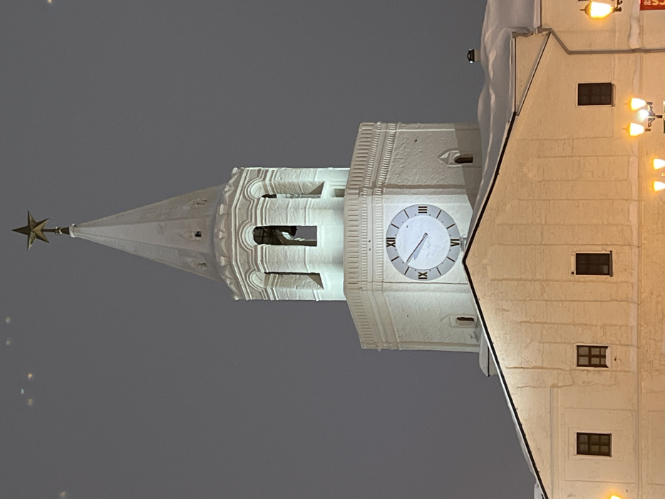 - "A nighttime vertical shot captures the upper portion of a brightly illuminated white stone clock tower, located in the city of Oktyabr'skii, Russia" by FM-9YGJx2, licensed under CC BY 4.0