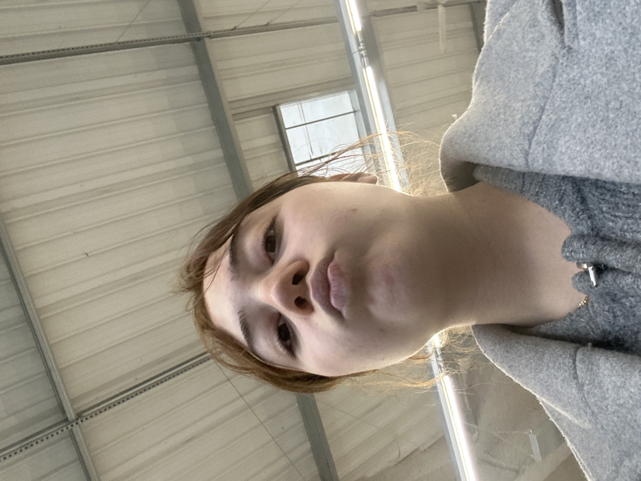 A woman angles her face downward toward the camera, her expression neutral. She is wearing a gray hoodie. The background reveals a large, metal-paneled ceiling with fluorescent lighting fixtures. A window appears in the distance. The image is taken at a skewed angle, making the woman the primary focus.