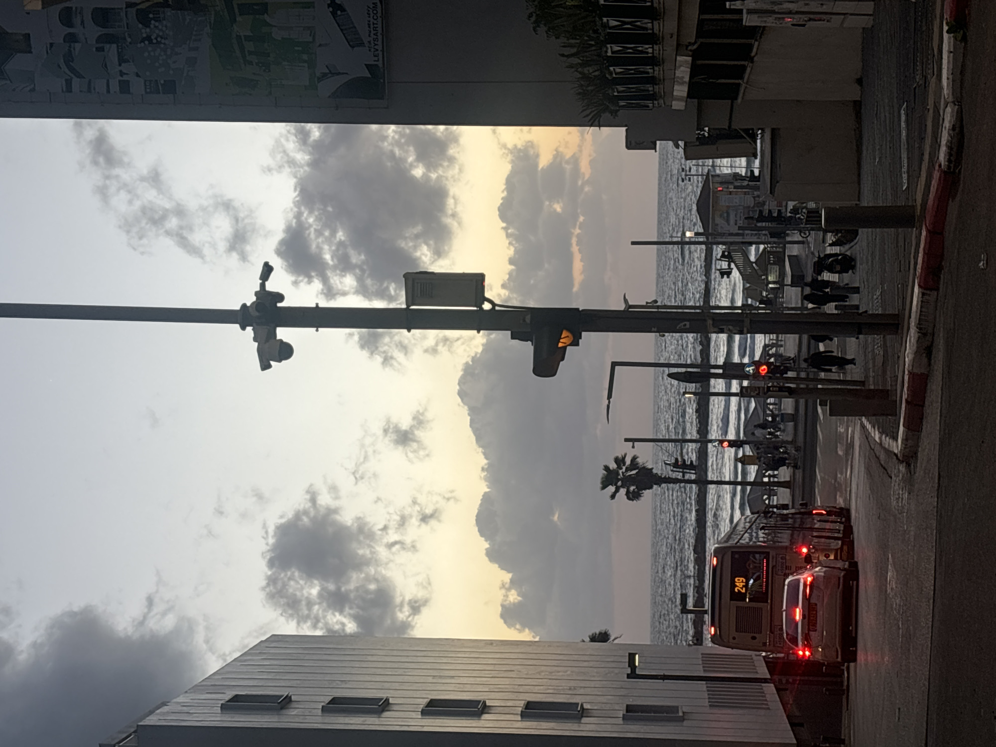 The image depicts a street scene in Tel Aviv, Israel, facing the Mediterranean Sea. The view is framed by buildings on either side of the street. On the right is a sidewalk and street with a red and white curb. Traffic, including a bus with the number "249" displayed, is present. Traffic lights are visible, some emitting a red glow. On the left, a building with a metallic-looking roof and rectangular windows is partially visible. A tall pole supports cameras and a traffic signal. Beyond the buildings, the sea stretches to the horizon, with clouds dominating the sky above. Palm trees and beach structures, including a lifeguard tower, are silhouetted against the skyline. People can be seen along the beach.