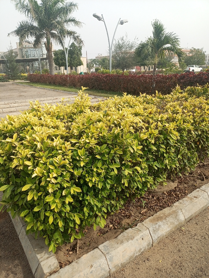 The image displays a landscaped outdoor environment in Gandu Albasa, Nigeria, under a hazy sky. In the foreground, a dense, low hedge of variegated green and yellow-green foliage runs horizontally, separated by a concrete curb from a darker ground surface. Immediately behind this, a second, parallel hedge of dark reddish-brown shrubs is visible. The midground contains multiple trees, including two prominent palm trees with feathery fronds and several smaller trees. Two modern streetlights, each featuring a curved dual-arm design with light fixtures, stand vertically within this section. In the background, several buildings are partially visible through the trees, including a multi-story structure with large windows on the far left. A white pickup truck is discernible on a distant paved surface to the right. No individuals are present, and no active interactions or specific actions are depicted.