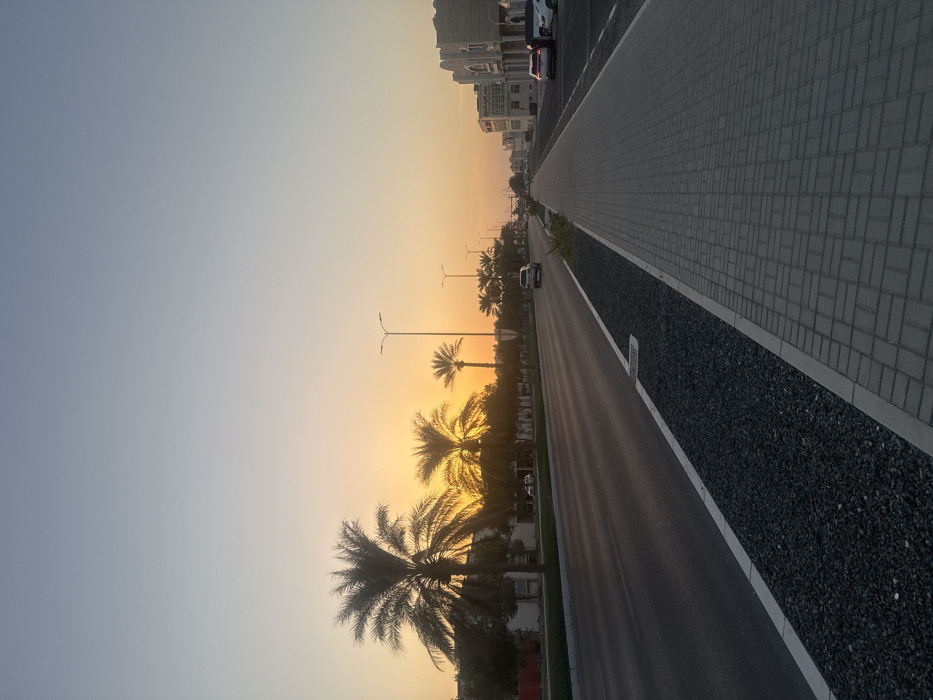- "The image displays an outdoor street scene in Al Jimi, United Arab Emirates, captured during sunrise or sunset, indicated by the low, intense orange-yellow light along the horizon and extending into a pale blue sky overhead" by FM-PtO4g1, licensed under CC BY 4.0
