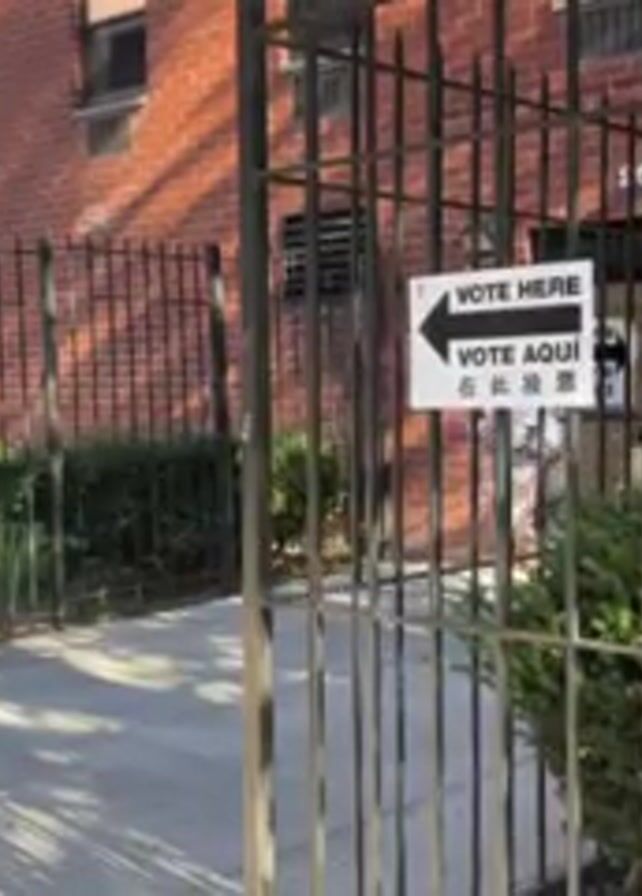 exterior of a brick apartment building with a black iron gate leading to the entrance. A sign is attached to the gate pointing toward the entrance that says "VOTE HERE" in English, Spanish, and Chinese. A woman wearing a light blue hooded sweatshirt and tan pants walks on the sidewalk through the gate toward the building. She appears to be holding a cell phone. The scene is lit by natural sunlight.