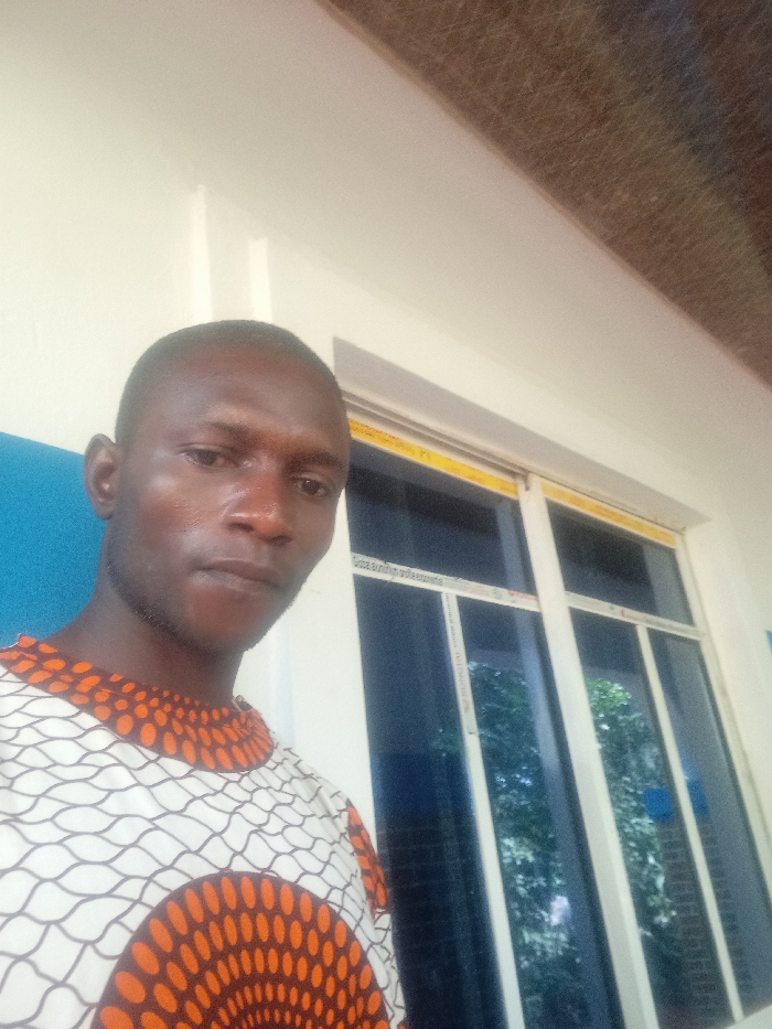 An adult male with dark skin and a short haircut is depicted in a chest-up portrait, looking directly at the camera with a neutral expression. He is wearing a short-sleeved top featuring a white base with a black net-like pattern and prominent orange and brown circular motifs. The background consists of a light-colored wall and a large, multi-pane window with white PVC frames. Yellow striping is visible along the top of the window frame, and the text "Gida quality profile system" is present on the white window components. The window glass appears dark, reflecting green foliage from an exterior environment. A section of a brown, textured ceiling or overhang is visible in the upper right quadrant of the image. This scene is situated within a building in Nsukka, Nigeria.