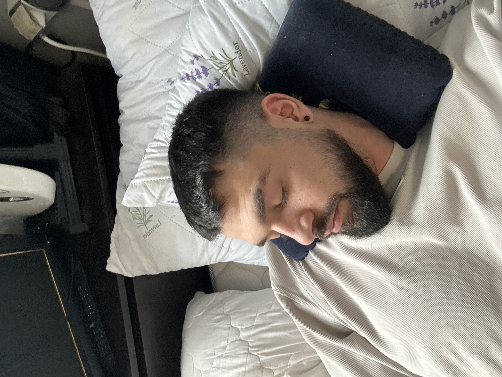 A man with short, dark hair and a full beard is sleeping on his side in a bed. He is resting on a white pillow with lavender print and a dark blue pillow. He is wearing a light-colored, textured shirt. The bed is next to a dark piece of furniture. The location is not discernible from the image, so it cannot be determined if it is in Sofia, Bulgaria.