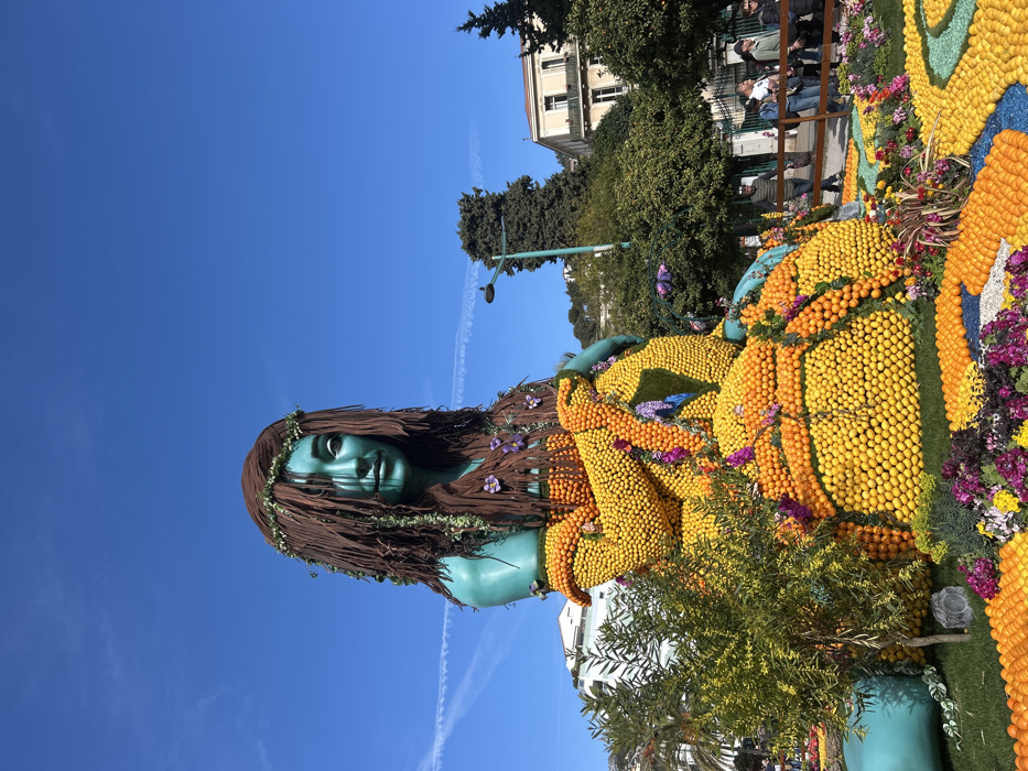 The image depicts a large, intricate sculpture of a seated female figure, situated outdoors under a clear blue sky in Menton, France