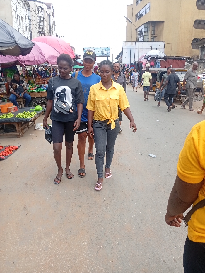 The image depicts a bustling street market scene in Onitsha, Nigeria