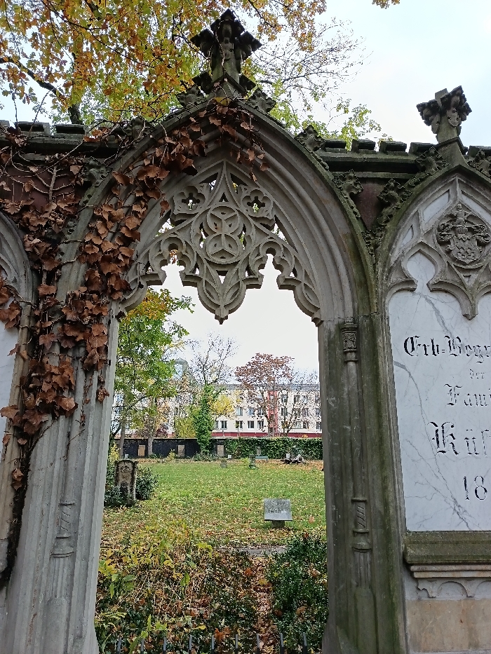 - "The image displays a scene within a historic cemetery in Leipzig, Germany, viewed through a stone Gothic Revival archway during autumn" by FM-rFWs12, licensed under CC BY 4.0