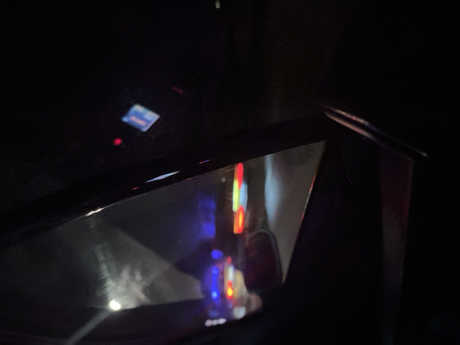 The image depicts a nighttime outdoor scene observed from the interior of a stationary or slow-moving vehicle in Войводино, Bulgaria. The perspective is primarily through the front windshield and a portion of the driver's side window. The vehicle's dark A-pillars frame the view on both sides. On the interior, a faint, rectangular digital display reflection is visible in the upper right, accompanied by a small red light or reflection. The exterior scene is dominated by artificial lighting against a dark background. In the mid-ground, multiple blurred blue lights, consistent with emergency vehicle strobes, are present. Below these blue lights, two distinct, horizontally elongated light bars are visible: one red and one yellow-green, suggesting a railway crossing barrier with active lights. The road surface below these lights appears wet and reflective, showing the light sources' illumination. A bright, diffused white light source is reflected on the upper left of the windshield. The overall environment is dark, indicating a night setting with limited ambient light beyond the illuminated elements. No individuals are visibly identifiable.