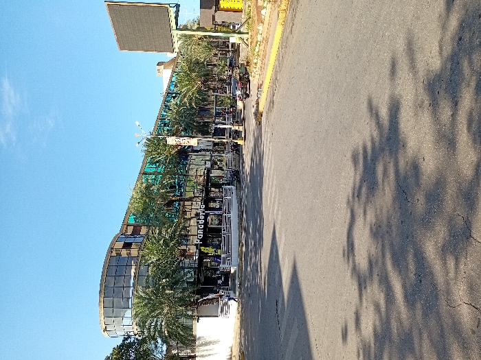 A modern building with a curved facade of glass and white trim stands next to a road. Palm trees line the building's edge. A large sign sits atop the structure. Shadows of trees stretch across the asphalt of the road. The sky is a clear, bright blue. The building's signage features the word "Panaderia". A yellow curb separates the building from the road.