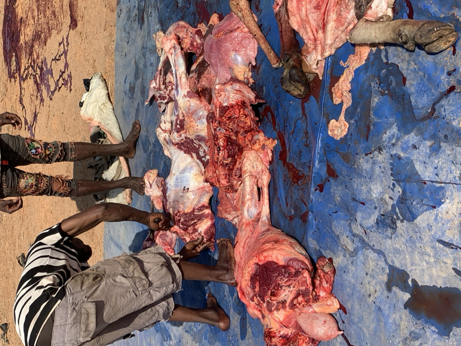 Two partially dressed men stand beside a butchered animal carcass on a blue tarp. The animal is divided into large sections of red and white meat, with what appear to be organs and limbs also visible. Blood stains the tarp and ground nearby. The men are barefoot; one wears a striped shirt and khaki shorts, the other has patterned leggings. The scene suggests a fresh kill or traditional butchering process.
