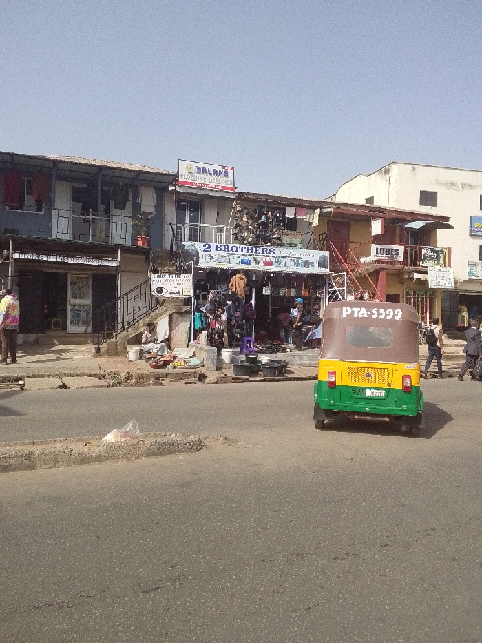 The image depicts a daytime street scene in an urban commercial area, identified as being in Jos, Nigeria