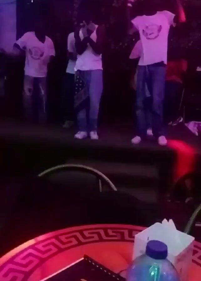group of three men dancing on a small stage, likely outdoors, during an event at a venue called Delicious Lounge. The men are all wearing white t-shirts, jeans, and white sneakers, and one of them is wearing a white baseball cap. They are performing a synchronized dance, moving their arms and bodies to the music. The stage is lit with colorful lights, including green and purple lasers. In the foreground, there is a table with a bottle of water, a menu, and a tissue box. The environment appears to be a restaurant or lounge with outdoor seating.