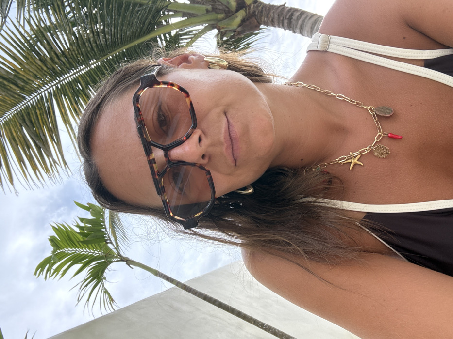 The image displays a female individual in a selfie orientation, looking directly at the camera in Kathaluwa, Sri Lanka. She wears large, octagonal tortoiseshell-patterned sunglasses with brown-tinted lenses. Her attire consists of a dark-colored top with light-colored straps. Visible accessories include a gold-colored hoop earring on her left ear and a gold-colored teardrop earring on her right ear. A gold-colored link chain necklace is worn, featuring multiple charms: a gold starfish, a gold textured circular charm, a red chili pepper charm, and an oval-shaped charm. The background reveals a partly cloudy sky, multiple green palm trees, and a light-colored building or wall section on the left.