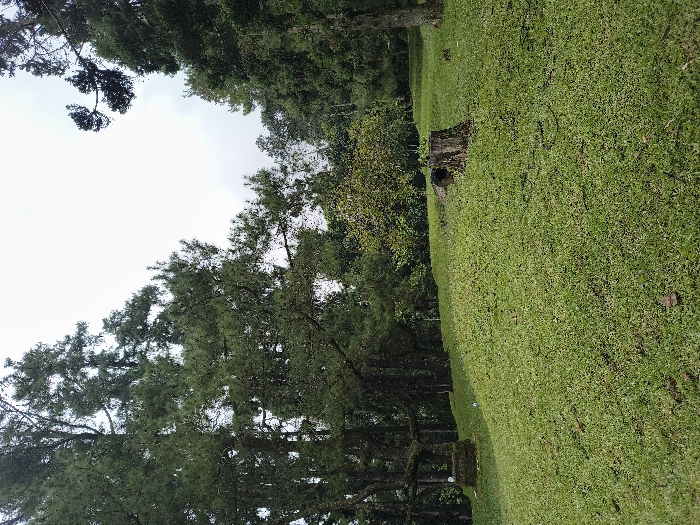 A serene landscape with a lush green lawn extending across the frame. A weathered tree stump stands as a focal point amidst the vibrant grass. Dense trees with intricate branches fill the background, partly obscuring a cloudy sky. The scene evokes a sense of tranquility in a natural setting.