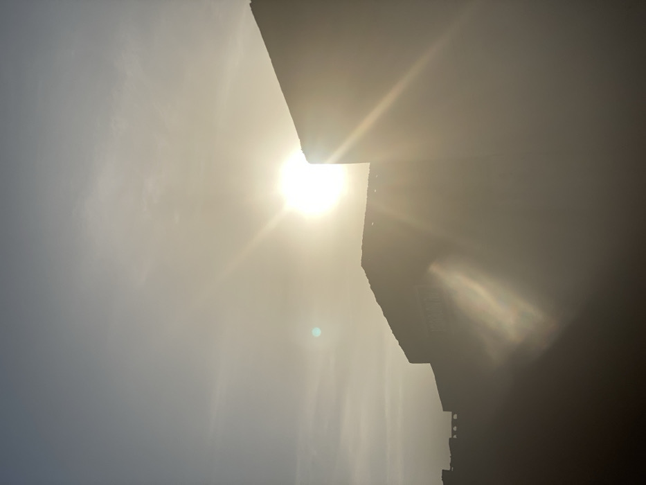 A sunburst dominates the image, partially obscured by the silhouette of a tall building. The sky is hazy and bright, causing a lens flare effect. The building's architecture appears complex, with multiple levels and edges, though details are lost in shadow. The image is oriented vertically, with the sky and sun to the left.