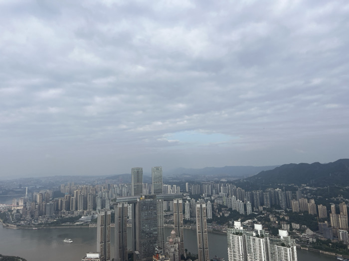 A high-angle view reveals a cityscape dominated by skyscrapers under a cloudy sky. A wide river curves through the urban landscape. Mountains rise in the hazy distance. The buildings vary in height and design, densely packed together. A single boat navigates the river. The sky is primarily gray with a hint of blue peeking through the clouds.