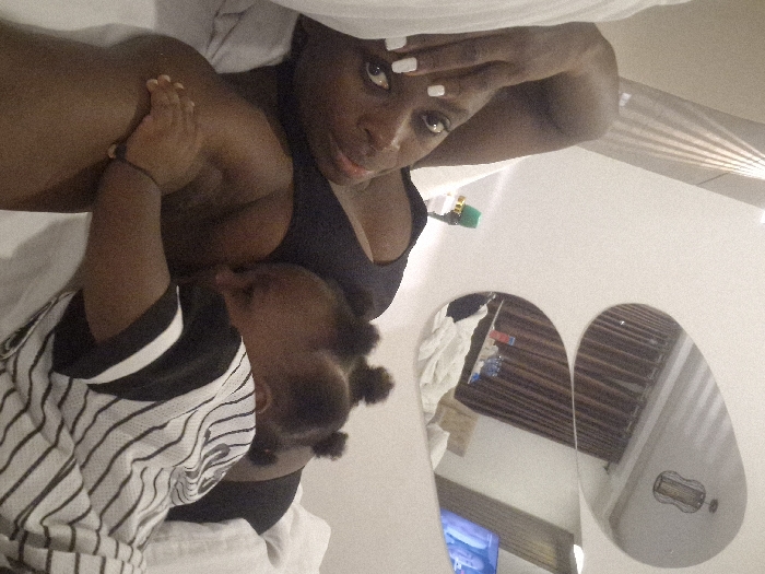A woman lies on a white sheet, breastfeeding a young child. She wears a black top, her hand raised to her forehead. The child is dressed in a black and white striped shirt. Two teardrop-shaped mirrors hang on the wall behind them, reflecting a room with blinds, a television, and various items. The scene is illuminated by soft light, creating a warm and intimate atmosphere.