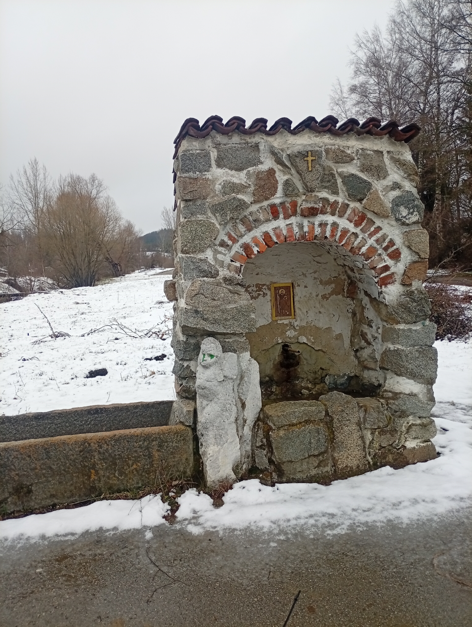The image displays a stone and brick structure, likely a public fountain or shrine, situated beside a grey asphalt road in an unknown city. The structure is primarily constructed from irregular grey and brown stones, featuring an archway made of red bricks with white mortar. The roof is composed of multiple rows of reddish-brown, curved tiles. A small, golden-colored cross is affixed to the stone wall above the arch. Within the arch, a small, framed religious icon depicting two figures is mounted above a metal spigot, which has dark staining below it. A rough stone basin is located beneath the spigot. To the immediate left of the structure, a long, rectangular stone trough is present. A roughly carved, light grey stone sculpture, depicting a figure with green paint on its face, stands at the base of the structure. The ground in the foreground consists of the road surface partially covered by thin ice and snow. The area around the structure and extending into the background is covered with a layer of snow. The background reveals a field with sparse, dry vegetation and numerous bare deciduous trees, indicating a winter setting. The sky is uniformly overcast and light grey. No individuals or animals are present.