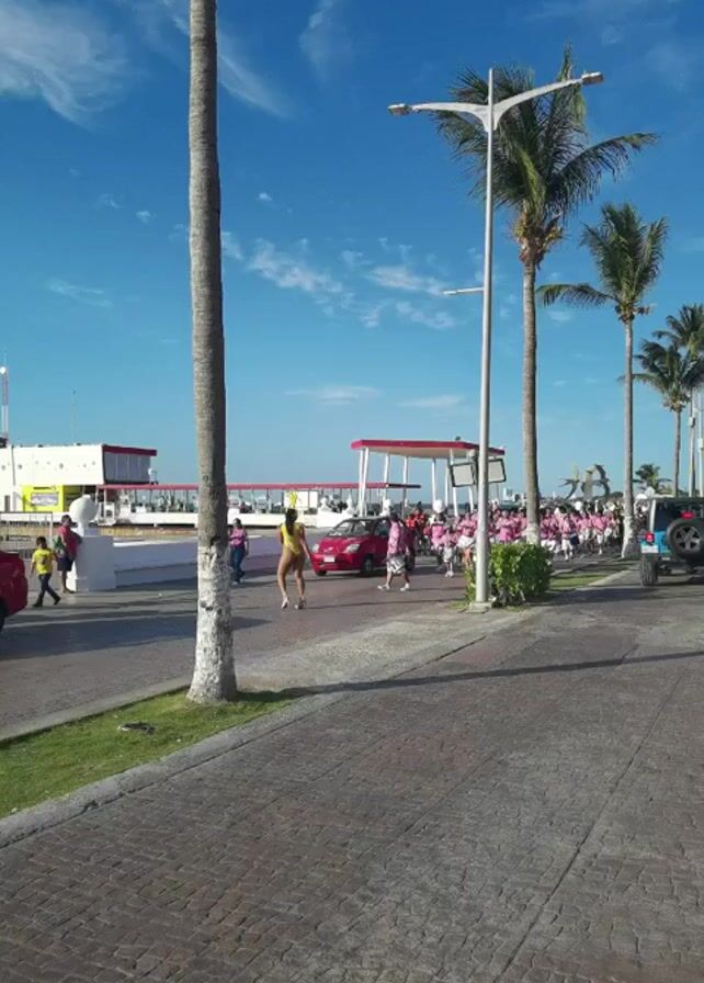 Certainly! Here's a forensic description of the video: **Setting:** * An outdoor scene appears to be a street or promenade near a waterfront area. The environment includes palm trees, lampposts, and buildings in the background. The sky is blue with some clouds. **People:** * There are several people visible, including one person wearing a yellow outfit walking on the sidewalk. A larger group of people, possibly a parade or procession, are seen walking in the street, many wearing pink. **Objects:** * Several vehicles are visible, including a red car. * Palm trees are prominently featured, lining the street. * Buildings and structures are visible in the background, near what appears to be a waterfront or beach. **Actions:** * People are walking along the sidewalk and street. * The group of people in pink appear to be marching or walking together in a procession. * A band is playing music. **Interactions:** * The people in the pink group are interacting by walking together. **Additional Notes:** * The scene is brightly lit, suggesting it is daytime. * A band is playing festive music, implying a celebration or event. * The sound includes musical instruments, likely drums and other percussion.