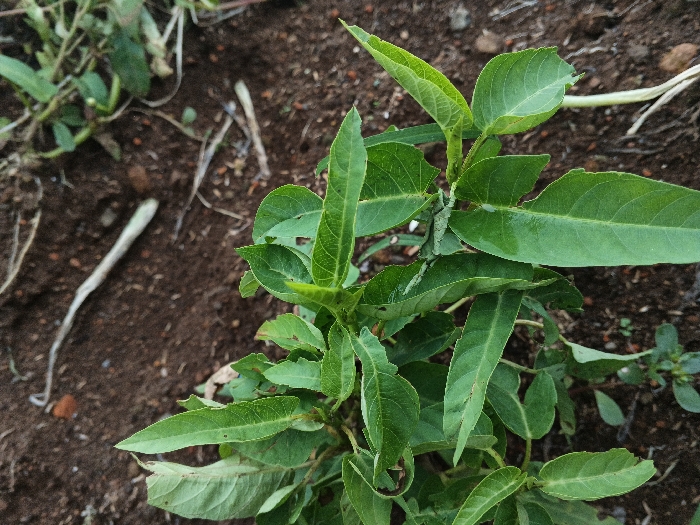 The image displays a close-up, top-down view of a cluster of green-leafed plants rooted in dark brown soil. The central plant exhibits numerous ovate to lanceolate leaves, predominantly light to medium green, with some appearing fresher than others and a few showing minor tears or irregularities along their edges. The plant's main stem is largely obscured by its foliage. The granular dark brown soil constitutes the ground, containing scattered small reddish-brown pebbles and sparse light-colored organic debris, such as dried plant stems. Additional, less distinct green foliage from other small plants or weeds is visible in the background, particularly in the upper left and lower right portions of the frame. The scene is illuminated by natural, ambient daylight. The location is Ho Chi Minh City, Vietnam.