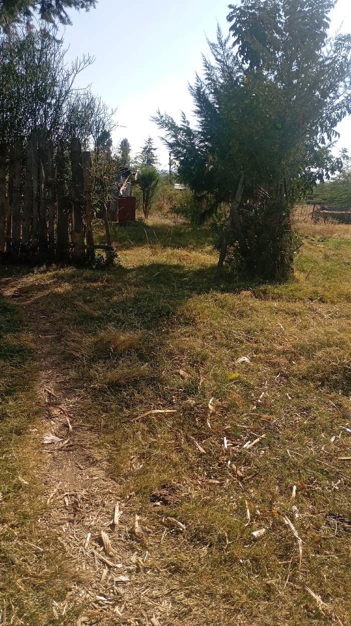 A sunlit rural scene shows a grassy field with scattered debris and a worn path. A makeshift fence of wooden posts and trees borders the path on the left. In the background, glimpses of buildings and greenery peek through the trees. The sky is light blue, with some tree tops showing. A small building stands next to the fence.