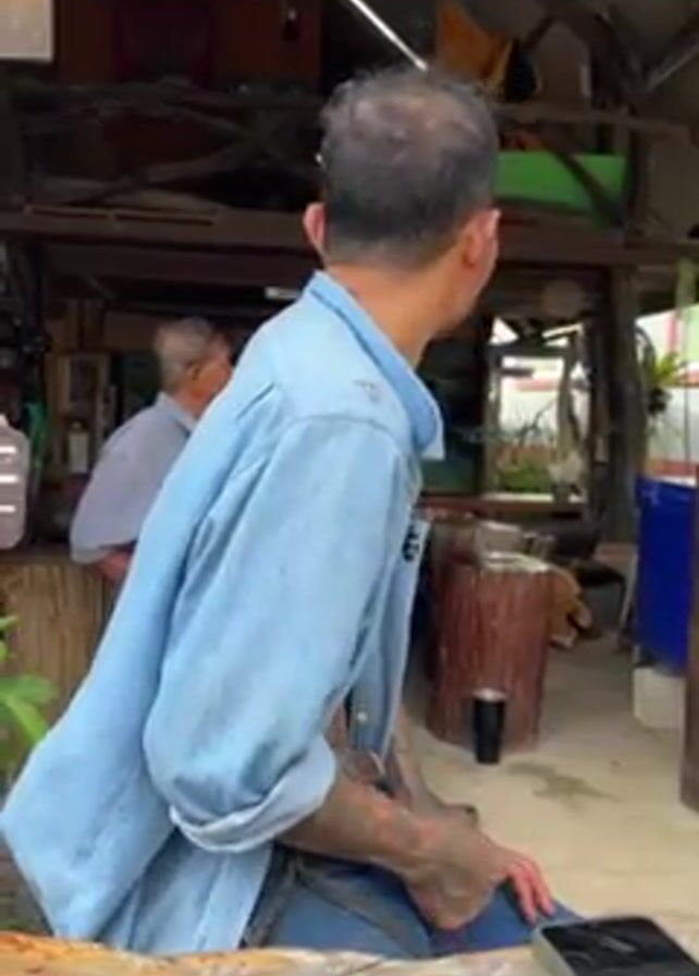 man sitting at a wooden table outdoors, with a sign above reading "OTTO'S DEEP JUNGLE". The man has short, graying hair, a mustache, and is wearing a light blue denim shirt over a dark t-shirt. He has tattoos on his arm and a necklace with beads and a metal pendant. He glances towards the camera and smiles slightly. In the background, another older man in a light-colored shirt is visible inside a structure that appears to be a bar or restaurant. There are wooden stools, plants, and a blue cooler visible around the table where the man is seated. A phone sits on the table. The setting seems to be a rustic outdoor area.