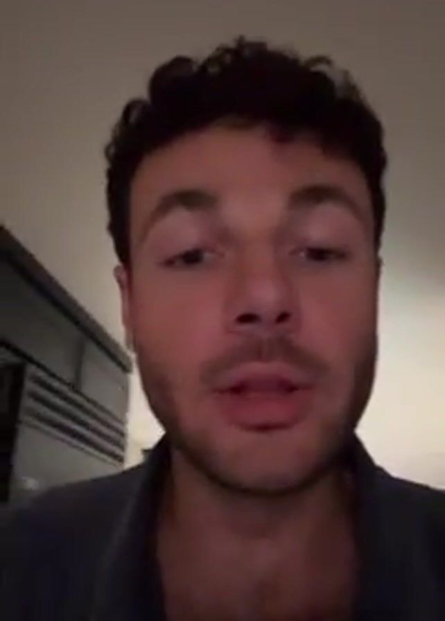 A man with short, curly brown hair and a short beard is looking directly at the camera. He is wearing a white T-shirt under a blue denim shirt. He speaks directly to the camera. The background is a plain white wall with a dark cabinet visible to the left.
