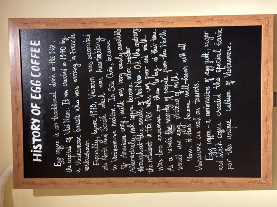 A rectangular blackboard-style sign, framed in light brown wood, is mounted on a plain, light beige wall. The sign features white, handwritten chalk text on a black background. The prominent title reads "HISTORY OF EGG COFFEE." Below the title, the text describes egg coffee as a traditional drink from Hà Nội, created in 1940 by a Vietnamese barista, explaining its origin due to milk scarcity in Hà Nội before 1975 compared to Sài Gòn. It further elaborates on its composition: egg yolk, sugar, and black coffee. No people, other subjects, or specific location details within Thủ Đức are visible in the image.