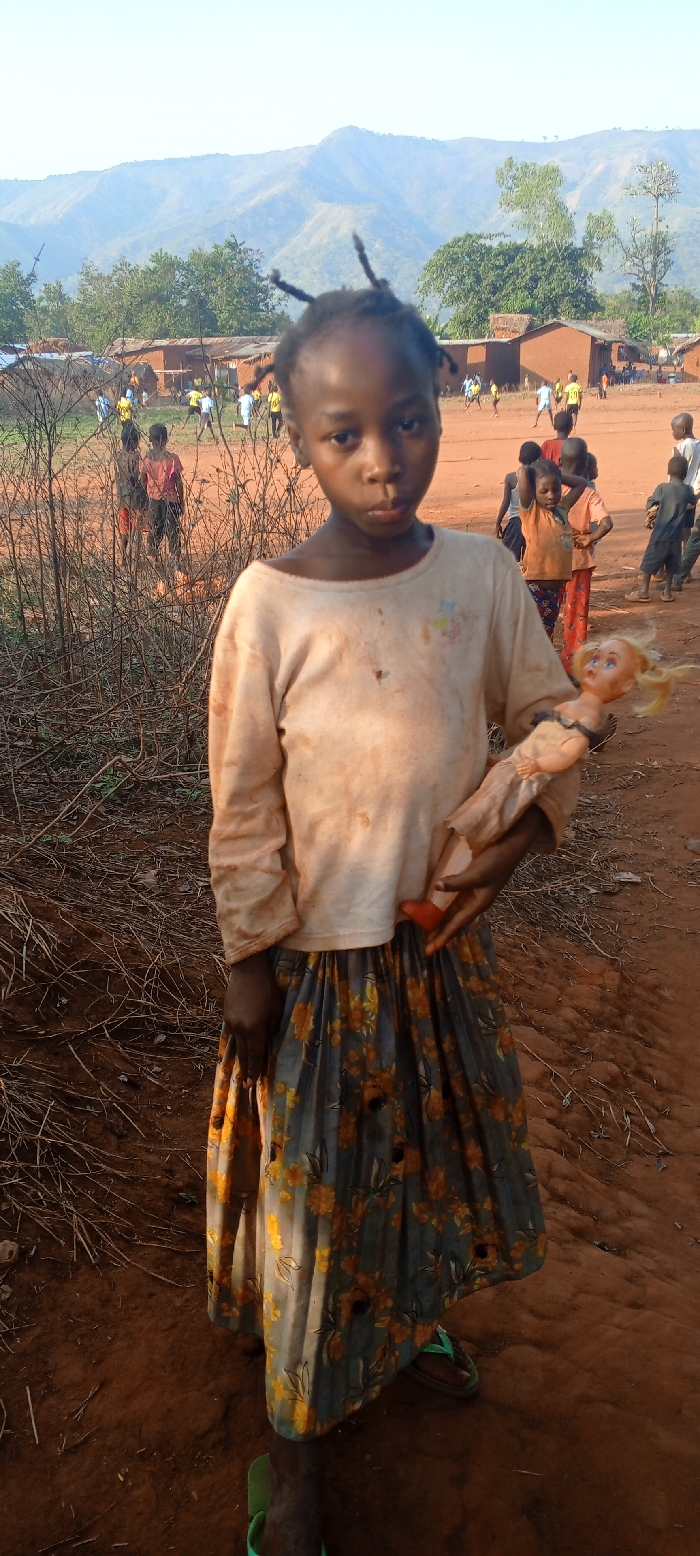 A young Black girl, estimated to be between 6 and 10 years old, stands on reddish-brown dirt ground in Konongo, Democratic Republic of the Congo. Her dark hair is styled in several short, upward-pointing braids. She wears a long-sleeved, light-colored shirt exhibiting visible stains and a long, pleated skirt with a blue-grey base featuring yellow and orange floral patterns. On her feet are light green flip-flops. She holds a light-skinned doll with blonde hair and light-colored clothing in her left arm; the doll's head is tilted. Her gaze is directed forward with a neutral expression. To her left, a patch of dry, sparse vegetation is present. In the midground, a group of individuals, primarily young males, are engaged in a football game on a large dirt field. Beyond the playing area, several single-story structures with reddish-brown walls and dark roofs are visible. The background consists of a range of green, vegetated hills under a clear, pale blue sky.