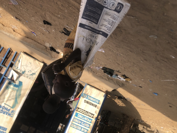 A young person is carrying a bag of "ANGAL CEMENT" on their shoulder. The person is near a storefront with signs advertising services such as online registration, remittance payments, printing, photocopying, binding, scanning, and phone charging. The surroundings appear to be dusty or sandy. The image is rotated, giving a tilted perspective of the scene.