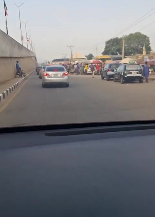 view from inside a car, looking out at a road with traffic and a roadside market. The car is moving slowly, following another silver car. The road has a concrete barrier on one side and is lined with streetlights. The roadside market is bustling with people and vendors under umbrellas and tents. There are several cars and auto rickshaws parked alongside the road near the market. The sky is overcast.