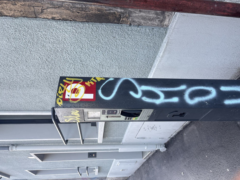 The scene depicts a street view in Gentilly, France, under daylight conditions. A dark grey, rectangular parking payment machine stands in the mid-ground on wet asphalt pavement, positioned to the right of a building facade. The machine features a display panel, a coin slot, and a keypad section. It is marked with several instances of graffiti: a red square sticker with a white 'P' symbol on its upper right side is defaced by yellow spray paint forming a spiral and text, including what appears to be "DIZZY" and "KTA". Additional yellow spray paint, possibly "Slow," is present on the machine's left side. Light blue spray paint forming vertical, stylized letters is applied to the machine's front, primarily on its lower half. Behind the parking machine, a light grey stucco building facade is visible, featuring two rectangular windows with white trim and horizontal grilles. A white downspout runs vertically along this facade, and a dark intercom unit is mounted near a building entrance on the left. A short, black metal railing is affixed to the building wall directly behind the parking machine. To the right of the machine, a continuation of the light grey stucco wall is visible, with a rust-colored vertical pipe present at the far right edge of the image. The asphalt pavement in the foreground is damp. No individuals or discernible actions are observed within the frame.
