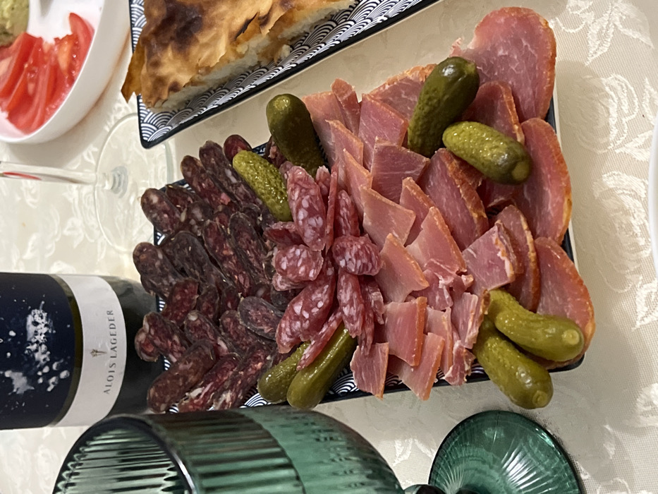 A dining table in Smolyan, Bulgaria, displays an array of food and beverages. In the central foreground, a rectangular platter with a blue and white patterned rim holds an assortment of sliced cured meats and gherkin pickles. The platter is divided into sections: the top contains darker, small-diameter sliced sausages; the middle holds lighter, small-diameter sliced sausages; and the bottom features wider, thinly sliced cured ham or pork loin. Small gherkin pickles are distributed among all three meat sections. Behind the platter, a dark wine bottle labeled "ALOIS LAGEDER" stands upright. To the immediate left foreground, a green, stemmed, ribbed drinking glass is visible. To the right of the wine bottle, the base and stem of a clear wine glass are partially visible. Further to the right, a white rectangular plate with a blue and white patterned rim contains a wedge of baked pastry, likely banitsa. In the upper right background, a small white bowl holds sliced red tomatoes. All items are resting on a light-colored tablecloth with a subtle woven pattern.