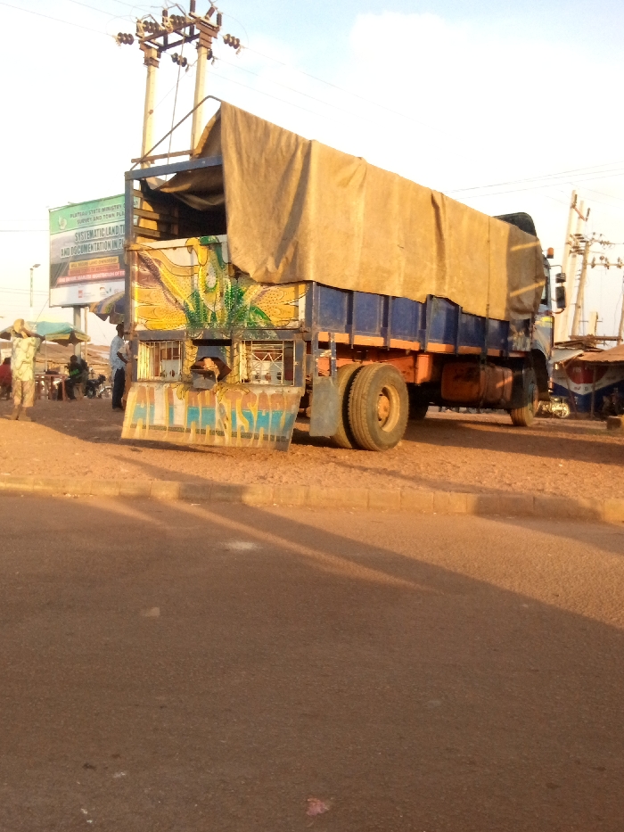 An outdoor scene in Mbar, Nigeria, depicts a large cargo truck parked on an unpaved shoulder adjacent to a paved road